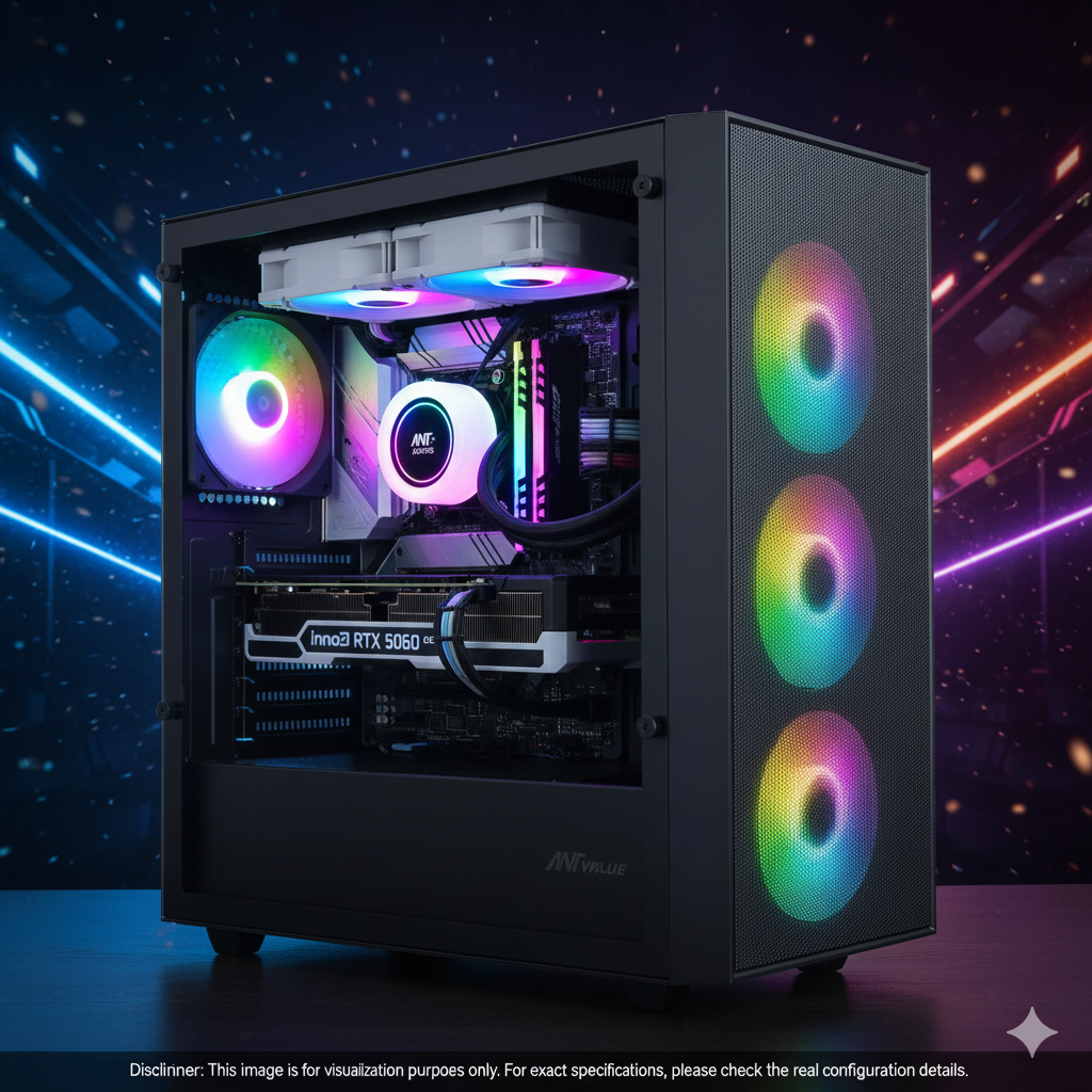 The build is completed with the Ant Esports VM40 gaming cabinet, combining cooling efficiency with sleek design, and the Ant Esports VS550L SMPS, which ensures stable and reliable power delivery.